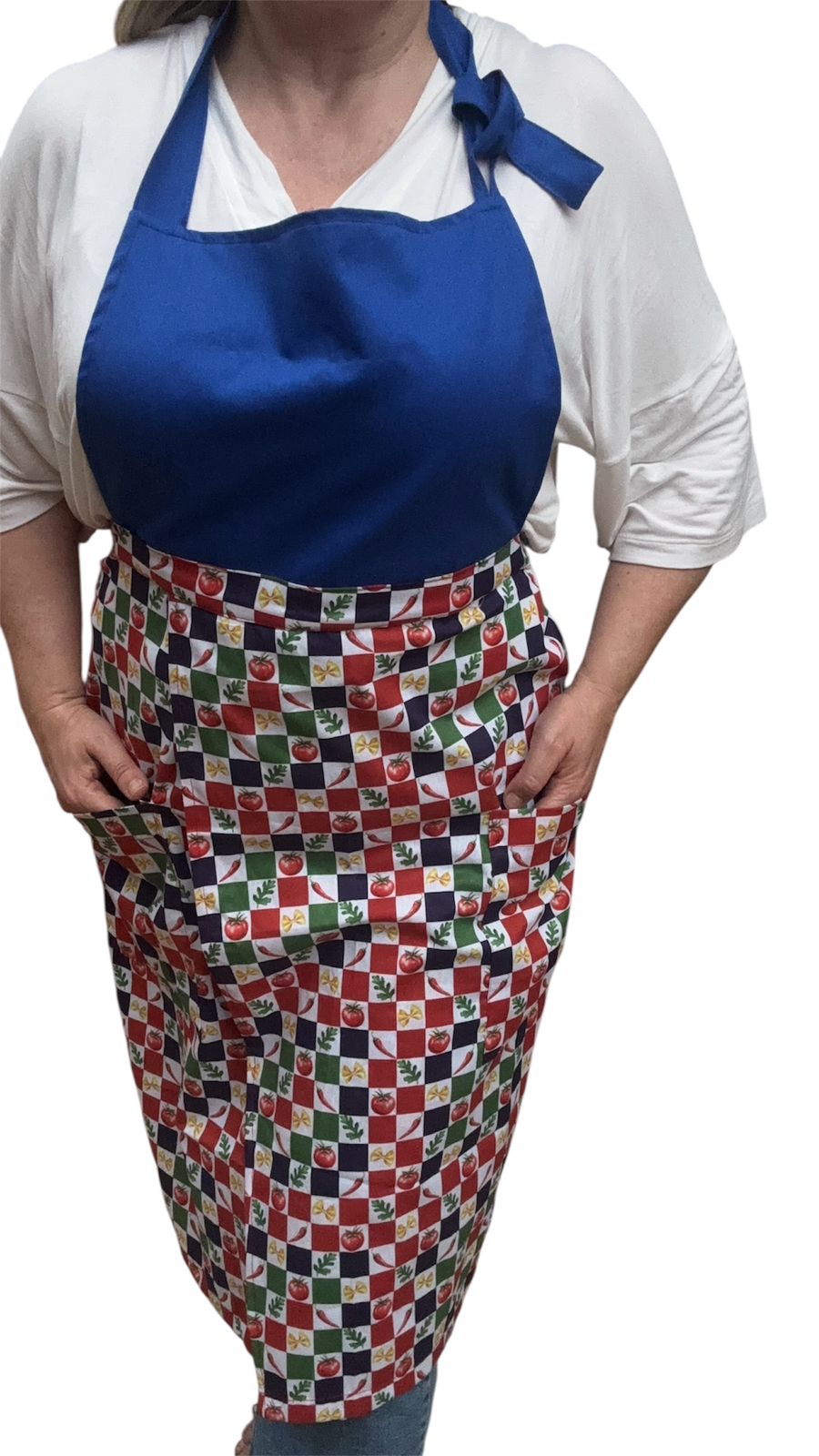 Peça feita em dois tecidos (sarja) liso peito e alça do avental e estampado(algodão) saia.